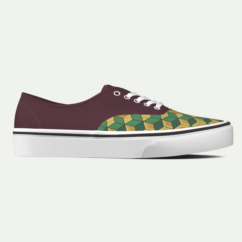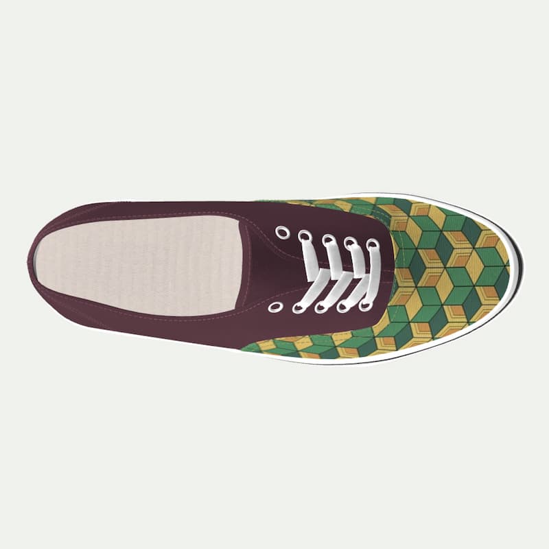 Su diseño divide el calzado en dos expresiones claras: un tono vino tinto profundo que transmite sobriedad y fuerza, y un patrón geométrico de escamas en tonos amarillo y verde que aporta dinamismo y carácter visual.